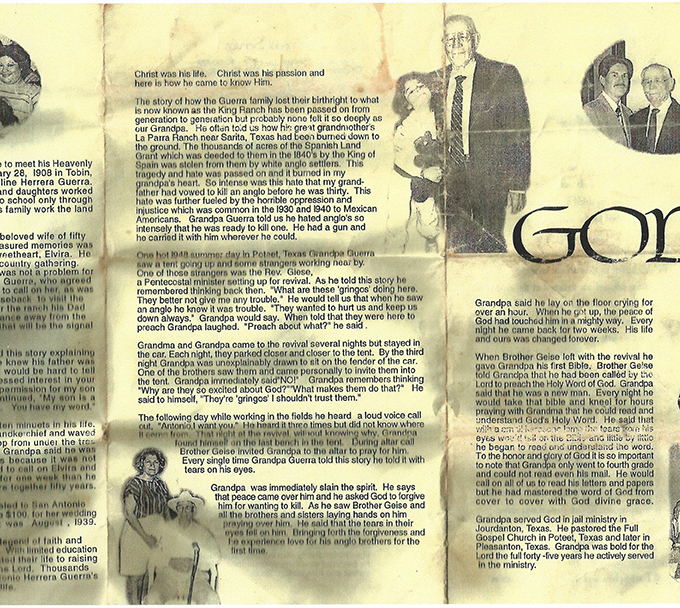 I learned much of the history of Mr. Mata's life in conducting the interview. For example, how someone could leave school so early and still achieve a level of success. I gained a new found respect for all the hard work and challenges, he and others in his generation have endured. Mr. Mata was very candid during his interview, sounding very excited and cheerful to be able to share his memories with me. I particularly enjoyed the part of the King Ranch history; Mr. Mata explains his families past and how the land, now called the "King Ranch," was allegedly stolen from them (See Pamphlet). This truth may have been lost to history if not successfully passed down generation to generation by oral tradition. That simple fact shows how important it is to embrace oral history and make it more a part of our families' traditions for generations to come.