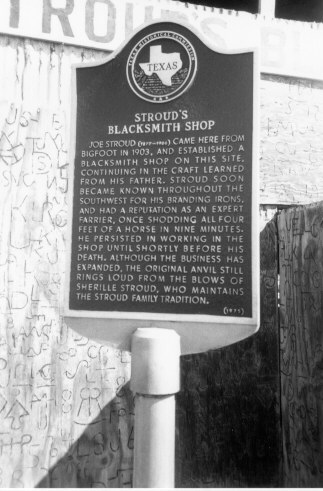 Behind the news office is Stroud's Blacksmith Shop which was established in 1903 by Joe Stroud, Sr. Learning this trade from his father and uncle, the trade has been passed down to generations and currently owned by Sherille Stroud, a son of Joe. This shop became known throughout the Southwest for Stroud's branding irons and with a reputation as an expert farrier. It was said he once shod all four feet of a horse in nine minutes. This establishment still stands and is said to be the oldest such shop in Texas.