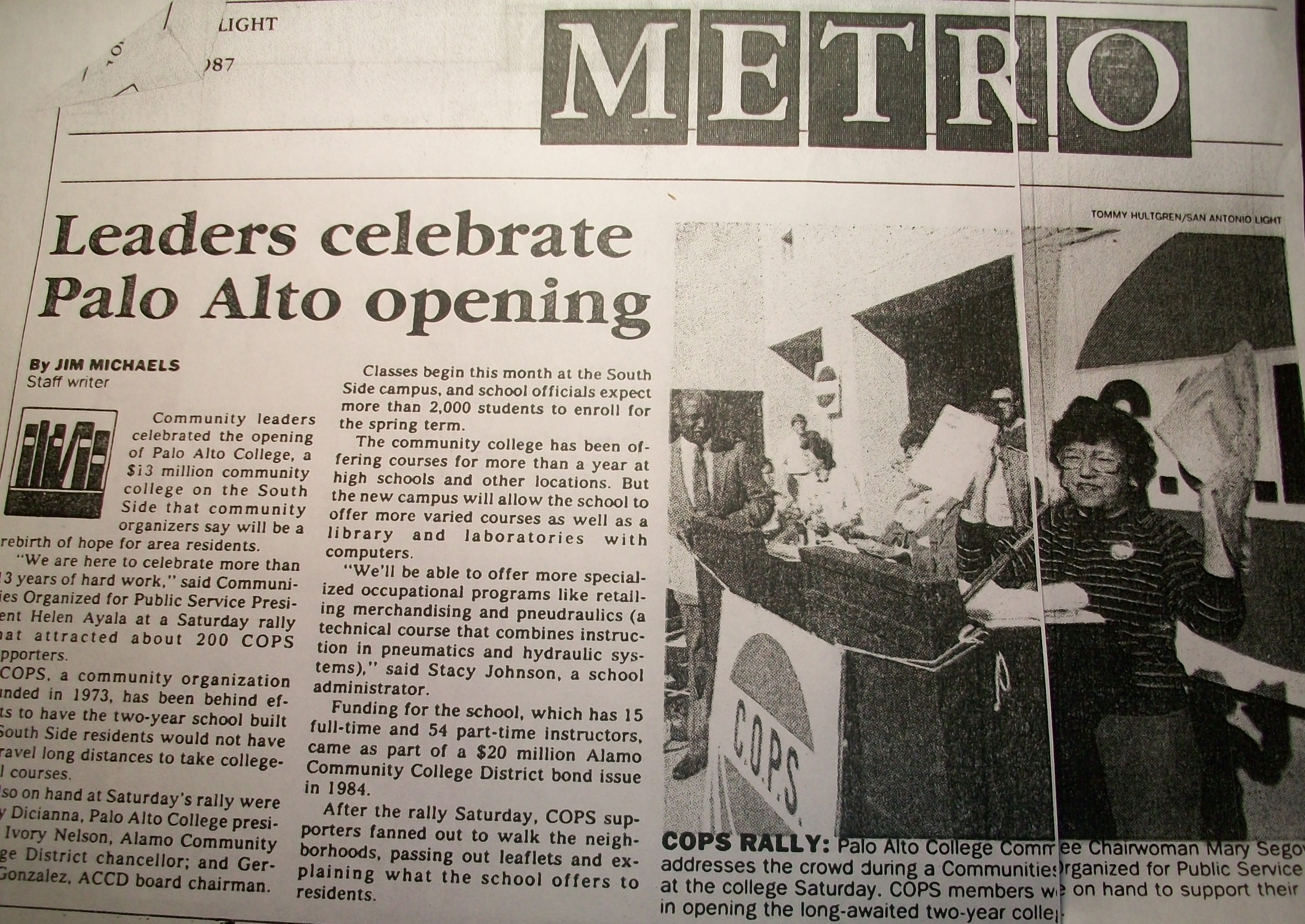 I did a lot of work I went to great lengths, I walked the streets getting people to vote for the bonds that we needed to get the money to build the college because we had no money and we had to get the word out to vote for them so city council would approve them. I remember that there was a rally and that we all lined up the whole community and city council was there and carried a banner with the COPS logo and we say "Oh when St. Bonn's comes marching in" and it was great we got the attention of everyone in the room. We had the vote and then ACCD said that if we wanted to have a college we had to locate the land. And so we needed one that had access to I-35 and 410 so we met up with city planning department and we got into a helicopter and we flew over the southside and looked for areas of land and we found two.But we ended up choosing the site where Palo Alto now sits. We had to make sure that because Kelly air force base being out there that we did not build on their flight overlay zone. But city council and ACCD finally approved it and then it was time to pick the architecture.